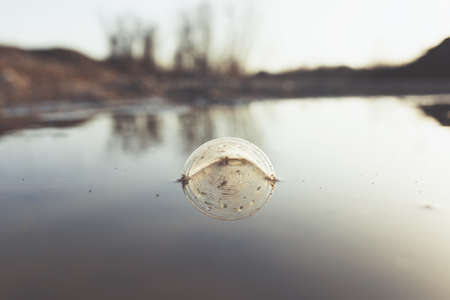 Plastic cup floating in lake water, wild dump landfill concept, barren tree in background