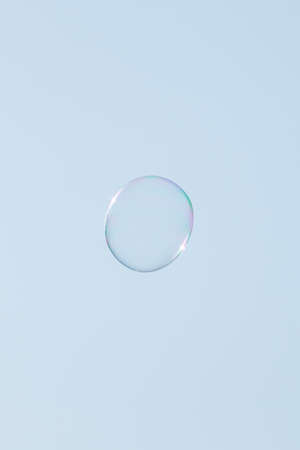 Coloured translucent soap bubble floating outdoors in the air on sunny evening with trees and sky in the background. Nature background with soap bubbles closeup. Soft dreamy image.