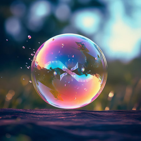 A close-up shot of a soap bubble, showcasing its iridescent colors and the reflections of its surroundings.