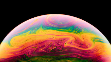 Blurred colourful soap bubble close up on black background. Creative background. Concept of space and creativity. Imitation of an unknown planet.