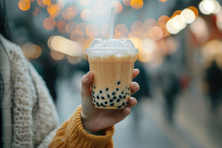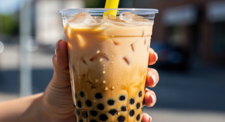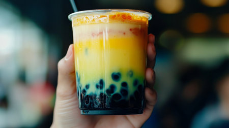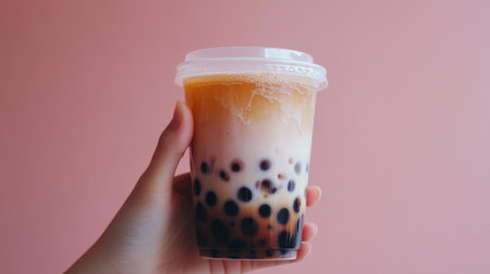 A close-up shot of a hand holding a cup of bubble tea, with the tapioca pearls visible at the bottom and the creamy layer on top, showcasing the delicious texture and colors.