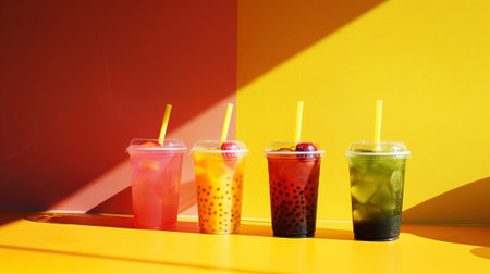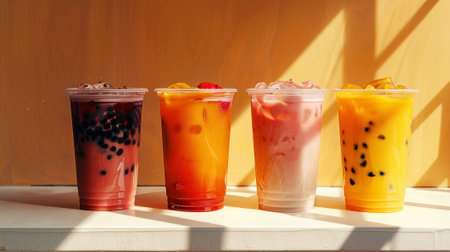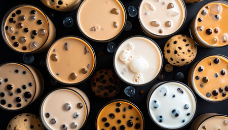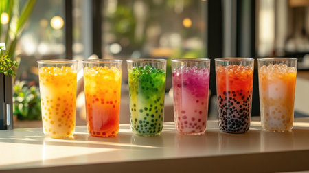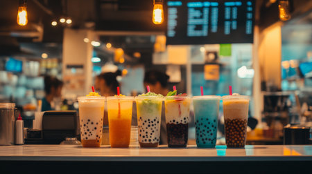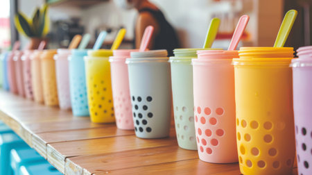 A colorful lineup of bubble milk tea cups in different flavors and sizes, enticing customers at a trendy bubble tea shop