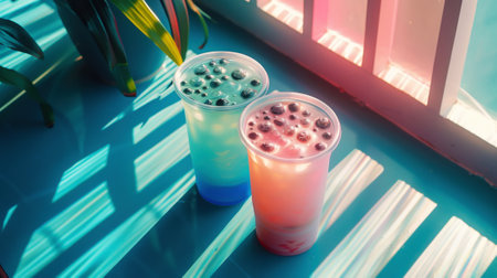 Aesthetic bubble tea, bright pink and blue colors. Beverage with tapioca bubbles. The trendy cafe. Summer vibes. Generative AI.