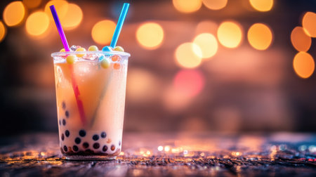 A vibrant drink with colorful tapioca pearls and colorful straws sits on a rustic wooden table, enhanced by soft, blurry lights that create a festive atmosphere.