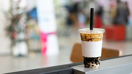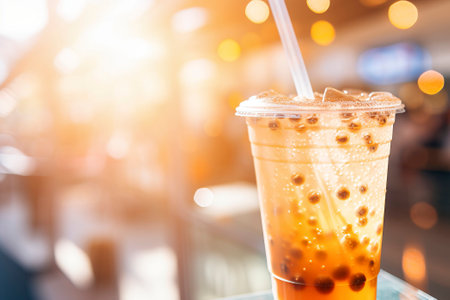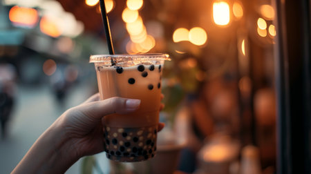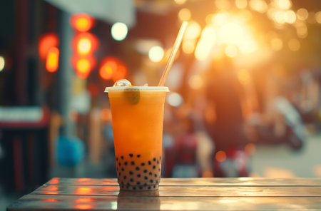Chilled bubble tea with tapioca pearls and ice in a plastic cup on a blurred street market background. Refreshing beverage and street food concept