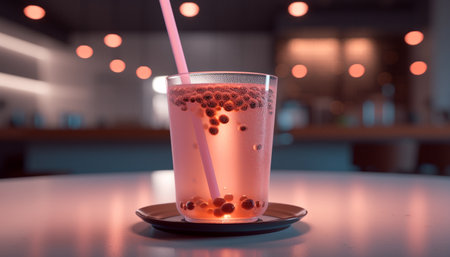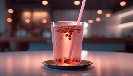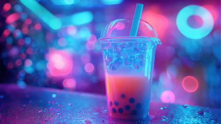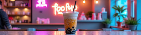 Bubble tea on cafe counter with neon lights in cozy atmosphere. That the image is generated using AI.