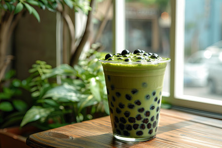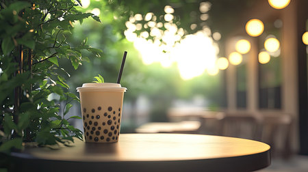 A refreshing bubble tea drink sits on a wooden table, surrounded by lush greenery, capturing a cozy outdoor cafe atmosphere filled with soft, natural light.