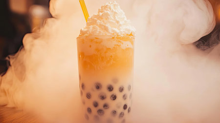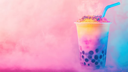 A visually stunning cup of colorful bubble tea topped with ice cream, set against a stylish cafe backdrop with vapor effects, evokes a sense of joy and refreshment.