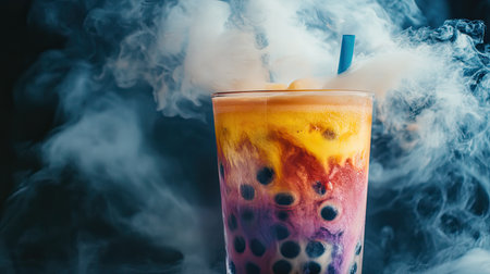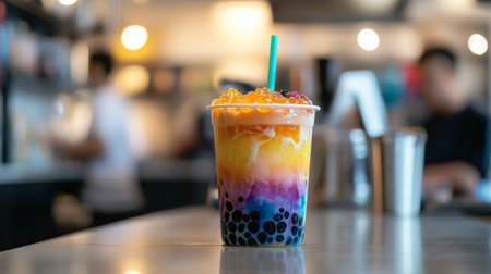 This vibrant boba tea, featuring colorful layers and frosty effects, captures a fun and trendy vibe, perfect for showcasing refreshing summer delights.