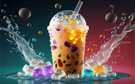 An engaging image of a transparent cup filled with layered milk tea and tapioca pearls, set against a colorful background that enhances its visual appeal