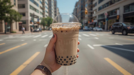 A person holds a cup of iced bubble tea with tapioca pearls in the middle of a modern city street.