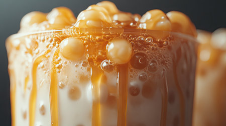A macro shot of a caramel bubble tea, focusing on the rich layers of caramel and milk tea, with tapioca pearls clustered at the bottom.