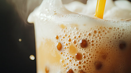 A detailed shot of a straw piercing through the thick layer of foam in a freshly shaken bubble tea, with the pearls visible beneath the surface.