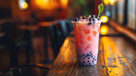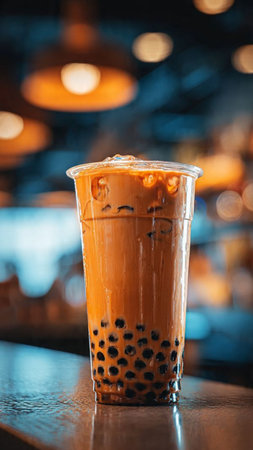 A refreshing cup of bubble tea showcasing tapioca pearls sits on a coffee machine counter, capturing the vibrant and delightful essence of beverage preparation.