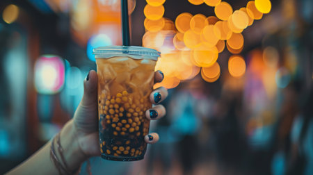 A refreshing cup of bubble tea filled with colorful tapioca pearls sits on a table. It is surrounded by a lively, glowing atmosphere at a night market.