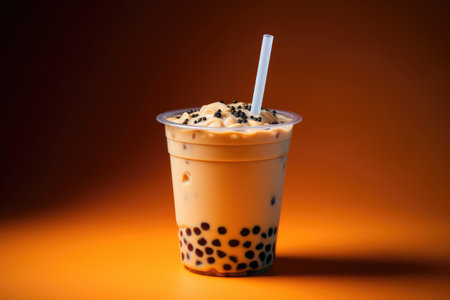 Iced Thai Milk Tea with Bubbles in Plastic Cup on Orange Background