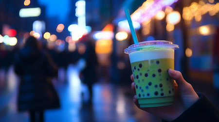 Enjoying a colorful bubble tea on a vibrant street during twilight in an urban setting
