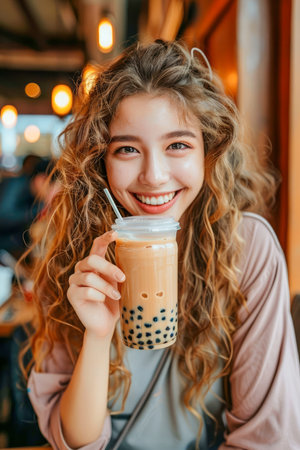 Smiling Young Woman Enjoying Boba Tea at a Cozy Cafe Happy Lifestyle and Refreshing Moments with Trendy Bubble Tea AI Generative