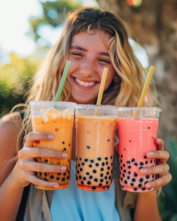 A young woman radiates joy as she holds three vibrant bubble tea cups, each bursting with colorful tapioca pearls The sunny day and lush outdoor setting create a refreshing summer vibe She smiles brightly, showcasing the delightful taste of these popular beverages AI Generative