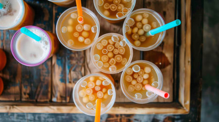 A top-down shot of a wooden tray holding multiple cups of bubble milk tea, each adorned with a colorful straw and a generous serving of chewy tapioca pearls