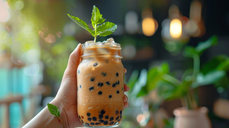 A hand holding a mason jar filled with iced bubble milk tea, garnished with a sprig of fresh mint for extra flavor.