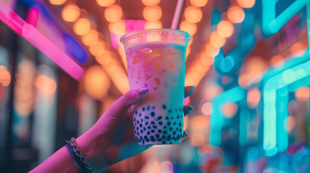 A person holding a bubble milk tea against a backdrop of colorful neon lights, reflecting in the glass.
