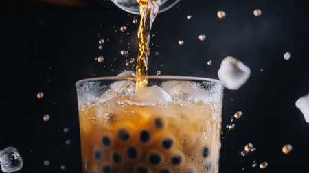 A dynamic shot of a bubble tea being poured from a shaker into a glass, with tapioca pearls and ice cubes visible, and droplets of tea splashing.