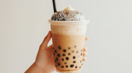 A close-up of a hand holding a cup of bubble tea with a decorative lid, showing the tapioca pearls and creamy tea through the transparent cup, with a white backdrop.