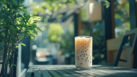 A refreshing iced beverage with tapioca pearls served in a clear glass at a sunny cafe. The friendly atmosphere is enhanced by lush greenery and warm light.