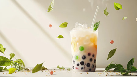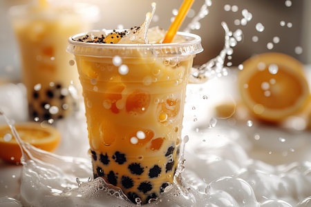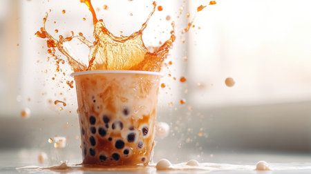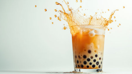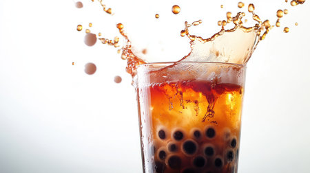 A dynamic shot of a cup of bubble tea with a splash of tea and pearls, showcasing the drink texture and layers with a bright, white background.