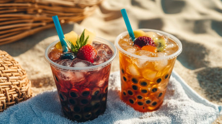 Two colorful summer drinks filled with bubbles, fresh fruits, and ice sit on sandy beach. Perfect for a refreshing sip during a relaxing day by the sea.