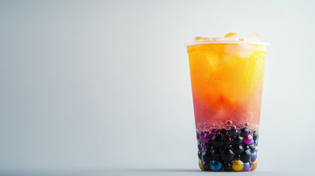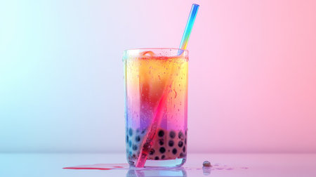 A vibrant image of a refreshing glass of bubble tea with a colorful straw, featuring visible tapioca pearls and tea layers, on a pristine white surface.