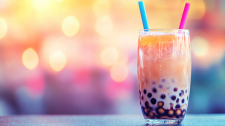 A vibrant glass of bubble tea filled with creamy milk tea and chewy tapioca pearls, garnished with a colorful straw, set against a bright, cheerful background
