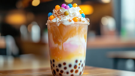 A refreshing glass of bubble tea topped with whipped cream and colorful pearls, set on a wooden table, capturing the trendiness and delightful flavors of this popular drink.
