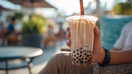 A hand holds a refreshing bubble tea drink in a transparent cup, showcasing its tapioca pearls and creamy texture, perfect for enjoying in the sunny caf