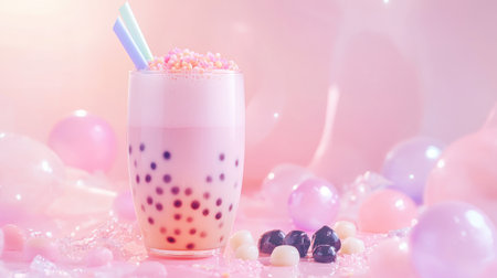 A vibrant bubble tea served in a glass with pastel toppings, surrounded by soft bubbles, perfect for summer refreshment or special occasions.