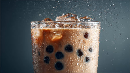 A refreshing iced beverage featuring boba pearls, captured in a clear glass with attractive condensation. Perfect for summer drink promotions and culinary inspiration.