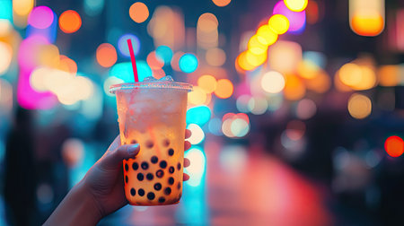 A hand holding a cup of iced bubble tea against a vibrant cityscape with blurred lights in the background.