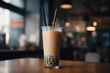 Refreshing sweet drink bubble tea with two straws in a cafe on a table, close-up. Generative AI.