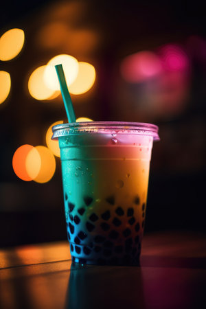 An AI generated illustration of a cup of bubble tea on the background of bokeh lights