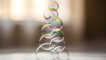 A macro shot of soap bubbles with iridescent colors, reflecting light, and a blurred, warm-toned background, creating a dreamy atmosphere.