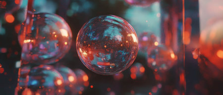 Elegant floating glass spheres reflecting multicolored lights generative ai
