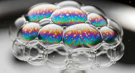 showing intricate cluster of iridescent soap bubbles reflecting vibrant colors on a neutral gray background. resolution