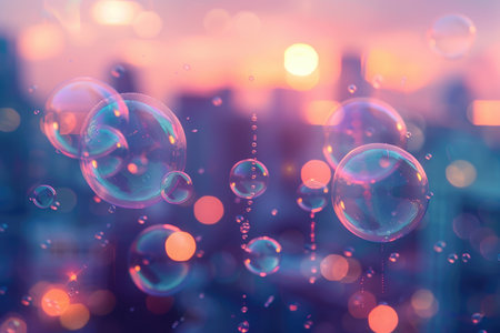 Magical floating soap bubbles with reflections against an urban sunset background. Concept of cityscape, bubbles, urban magic, evening glow. Vertical.