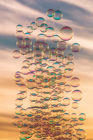 Beautiful soap bubbles with sunset sky background. Colorful soap bubbles.