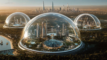 Futuristic Megacity Encapsulated in Transparent Domes Promotes Sustainability Through Renewable Technologies and Enhanced Air Quality Generative AI