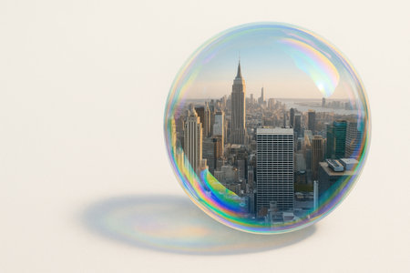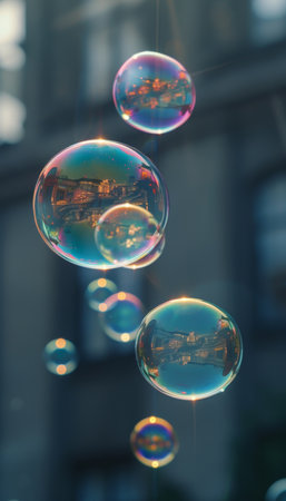 Close-up of colorful soap bubbles floating in a cityscape. Concept of whimsical scenes, urban environment, childhood joy, and playful moments.