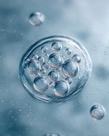 Bubbles rise and float in clear water, creating a simple scene with soft lighting. The clear background adds depth to the view of the bubbles in motion.