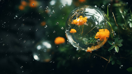 Abstract sphere of multi colored bubbles reflects nature beauty outdoors generated by artificial intelligence