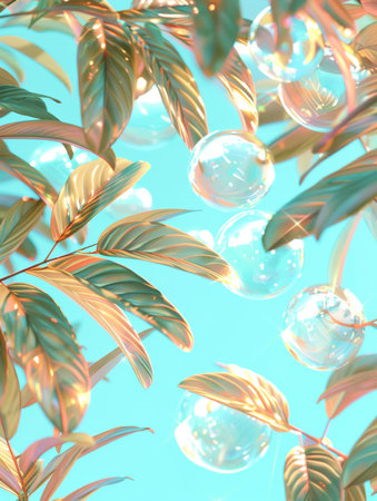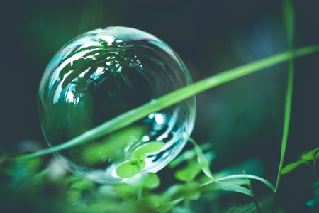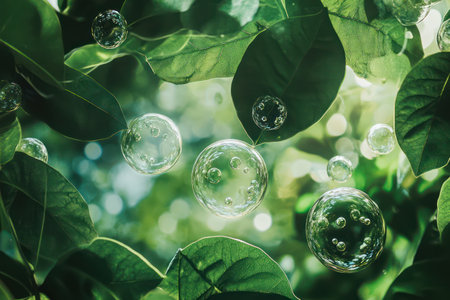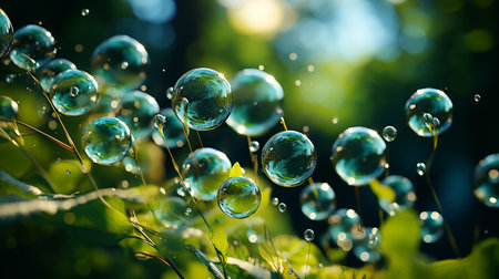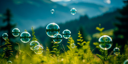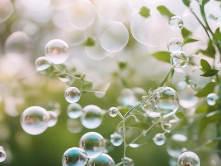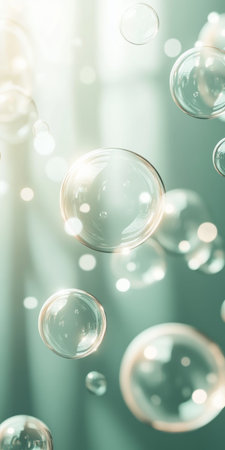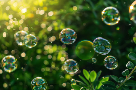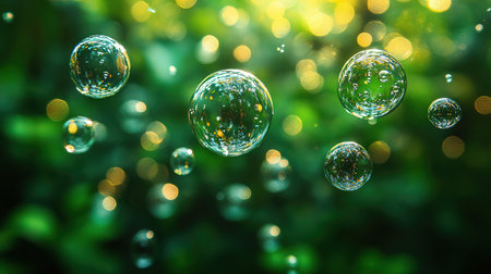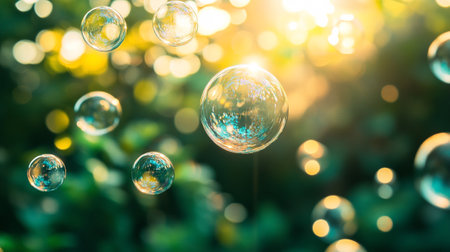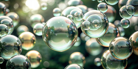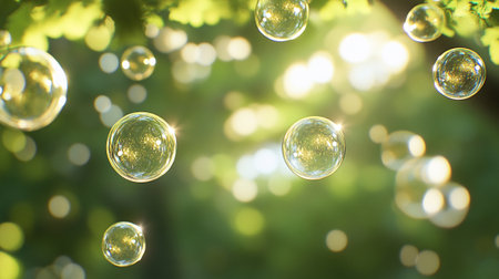 Floating Translucent Bubbles with Sunlight and Soft Green Background in Abstract Composition.